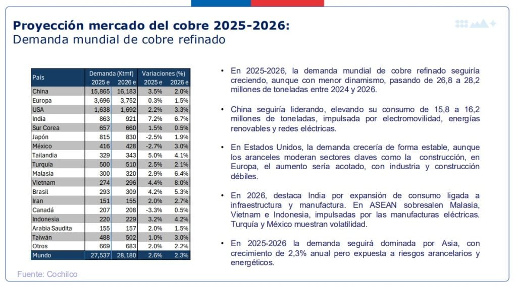Por el lado del consumo, Cochilco estima que la demanda de cobre refinado aumentará desde 27,6 millones de toneladas en 2025 a 28,2 millones de toneladas en 2026. La mayor parte de este incremento estará explicada por China, seguida de India y el sudeste asiático, regiones donde la expansión industrial, energética y de infraestructura sigue requiriendo grandes volúmenes del metal.