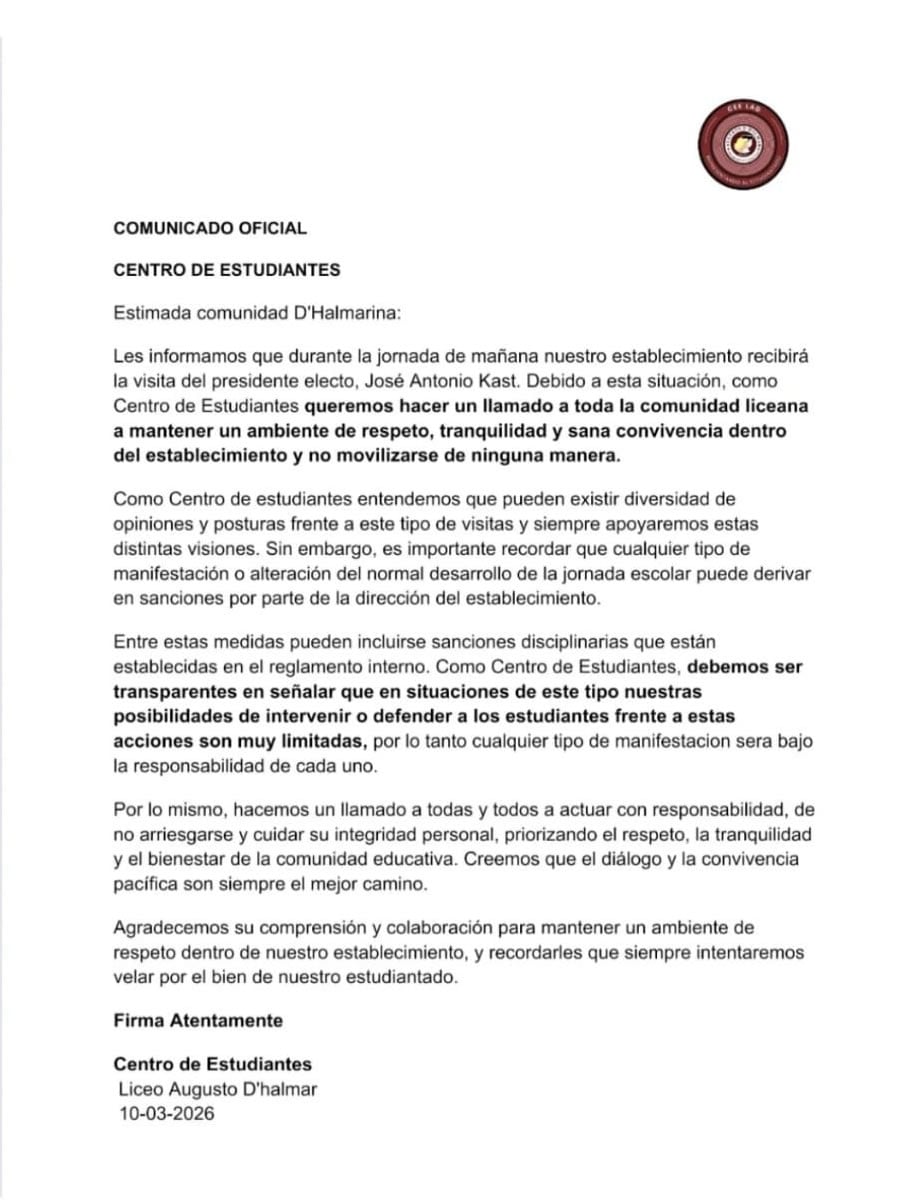 Las alarmas se encendieron luego de que el Centro de Estudiantes (CEE) del liceo publicara un comunicado refiriéndose a la visita de Kast, advirtiendo posibles sanciones por parte de la dirección, ante «cualquier tipo de manifestación o alteración del normal desarrollo de la jornada escolar».