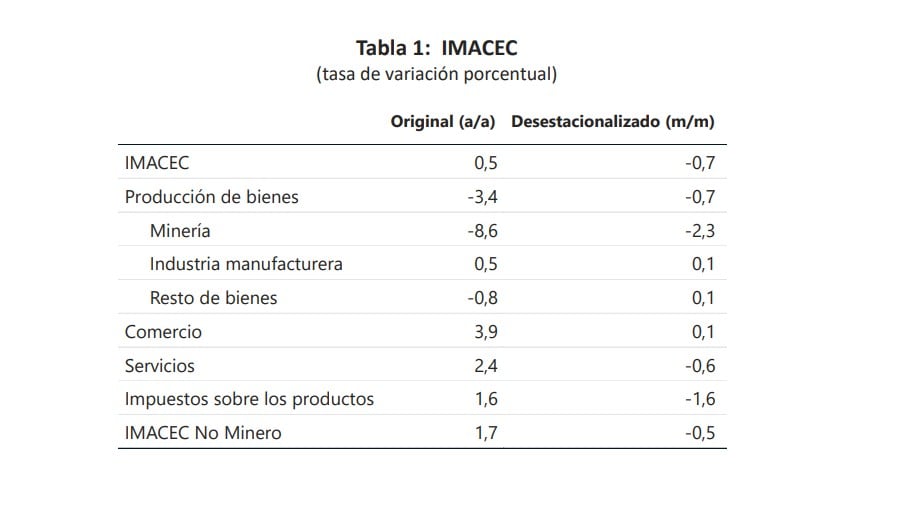 El Banco Central atribuye el resultado a la fortaleza de servicios y comercio, contrapesada por una fuerte caída en minería. La baja mensual desestacionalizada la explican, justamente, servicios y minería.