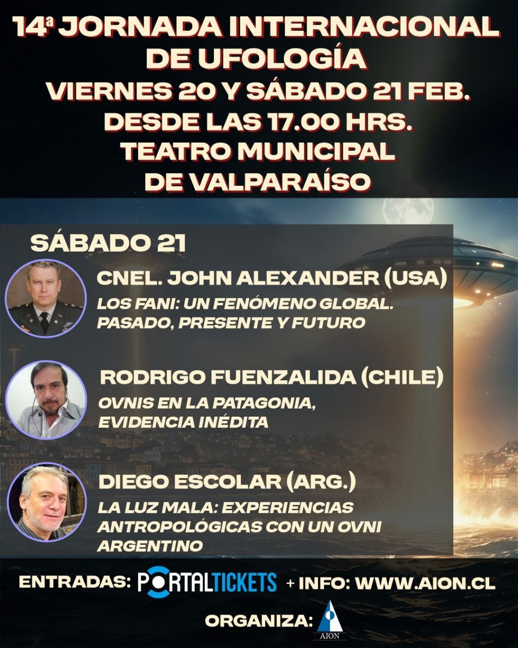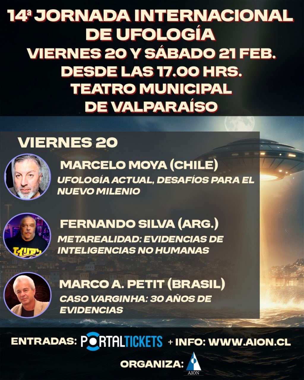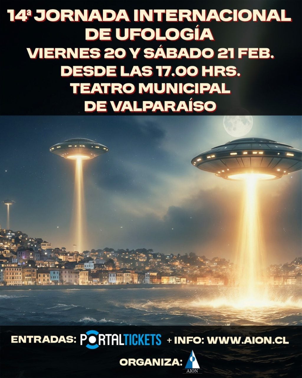 La Décimo Cuarta Jornada Internacional de Ufología es organizada por AION (Agrupación de Investigaciones Ovniológicas de Chile), producida por Wakii Comunicaciones y cuenta con el apoyo del Teatro Municipal de Valparaíso, Radio Bío Bío de Valparaíso, La Estrella de Valparaíso y el Canal de Televisión, TVR.