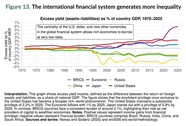 Aproximadamente el 1 % del PIB mundial fluye cada año de los países más pobres a los más ricos a través de transferencias netas de ingresos asociadas a altos rendimientos y bajos pagos de intereses sobre las deudas de los países ricos, según el informe, casi tres veces la cantidad de la ayuda mundial al desarrollo. La desigualdad también está profundamente arraigada en el sistema financiero mundial. La arquitectura financiera internacional actual está estructurada de manera que genera sistemáticamente desigualdad. Los países que emiten monedas de reserva pueden pedir préstamos de forma persistente a un coste menor, prestar a tipos más altos y atraer el ahorro mundial. Por el contrario, los países en desarrollo se enfrentan una situación inversa: deudas caras, activos de bajo rendimiento y una salida continua de ingresos.