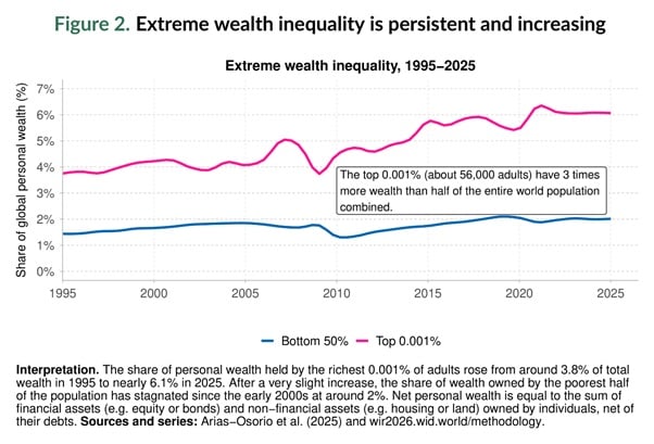 Esta concentración no solo es persistente, sino que también se está acelerando. Desde la década de 1990, la riqueza de las y los multimillonarios y centimillonarios ha crecido aproximadamente un 8 % anual, casi el doble de la tasa de crecimiento experimentada por la mitad más pobre de la población. La gente más pobre han obtenido modestas ganancias, pero estas se ven eclipsadas por la extraordinaria acumulación en la cima. La parte de la riqueza mundial en manos del 0,001 % más rico ha pasado de casi el 4 % en 1995 a más del 6 %, según el informe, mientras que la riqueza de las y los multimillonarios ha aumentado alrededor de un 8 % anual desde la década de 1990, casi el doble de la tasa del 50 % más pobre.