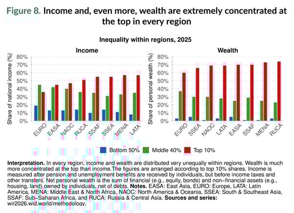 Los ingresos se distribuyen de forma desigual en todas partes, y el 10 % más rico obtiene sistemáticamente mucho más que el 50 % más pobre. Pero en lo que respecta a la riqueza, la concentración es aún más extrema. En todas las regiones, el 10 % más rico controla más de la mitad de la riqueza total, dejando a menudo a la mitad más pobre con solo una pequeña fracción.