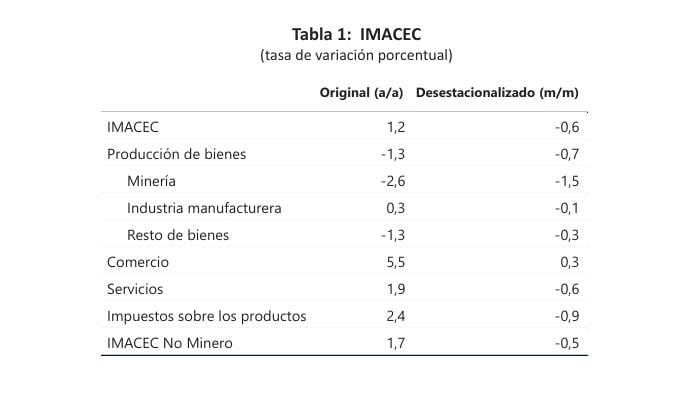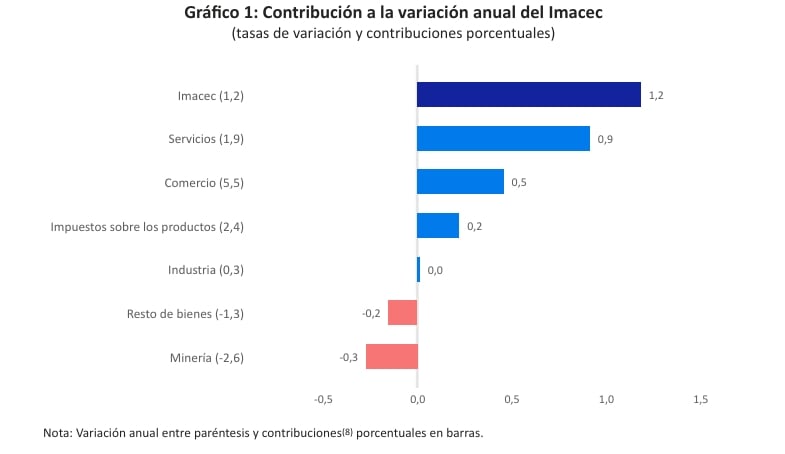 En la variación anual (Gráfico 1): El comercio (+5,5%) aportó 1,0 punto porcentual (pp) al crecimiento total del Imacec (1,2%). Los servicios (+1,9%) contribuyeron con 0,9 pp, y los impuestos sobre los productos (+2,4%) sumaron 0,5 pp. Estos impulsos positivos fueron contrarrestados parcialmente por los arrastres negativos de la minería (-2,6%, -0.3 pp) y del resto de bienes (-1,3%, -0.2 pp), mientras que la industria tuvo una contribución de 0,3%.