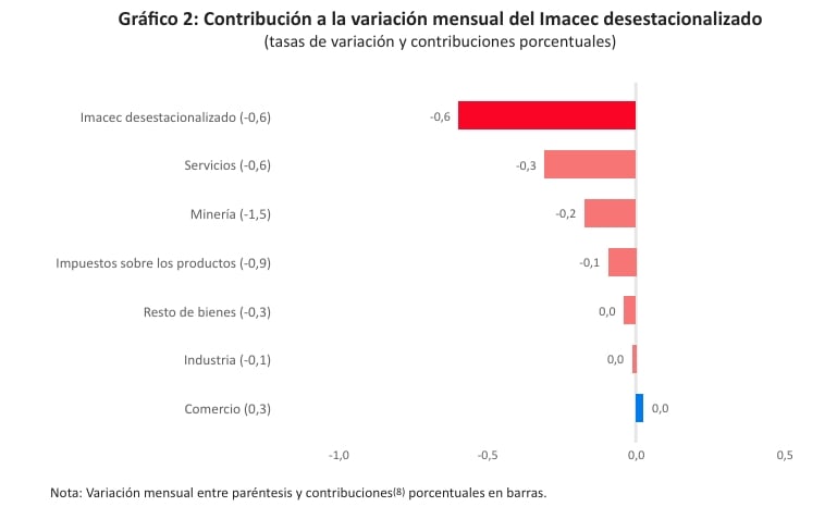 «El resultado del Imacec se explicó por el crecimiento de los servicios y el comercio, lo que fue en parte compensado por la menor producción de la minería y del resto de bienes», detalla el informe oficial. A su vez, precisa que «la caída del Imacec en términos desestacionalizados fue determinada por los servicios y la minería».
