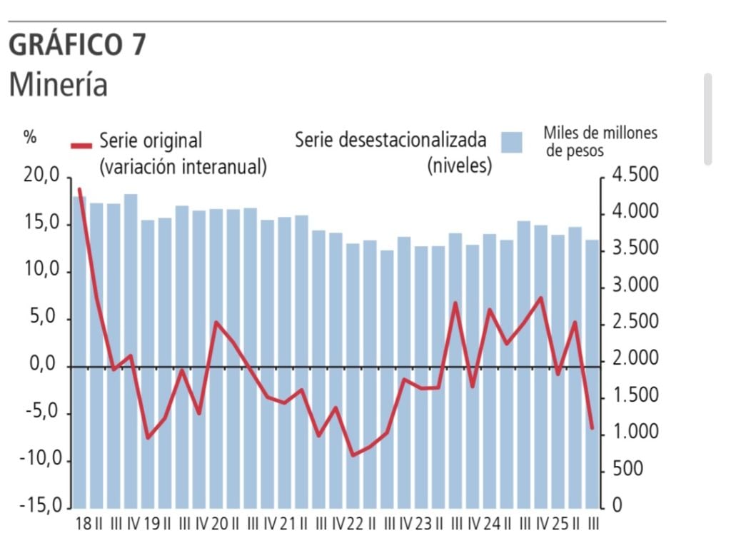 Uno de los factores clave que lastró el resultado global fue el desempeño de la actividad minera, que retrocedió un 6,5% en el tercer trimestre . Este sector, vital para la economía chilena, se vio afectado principalmente por una menor producción de cobre.