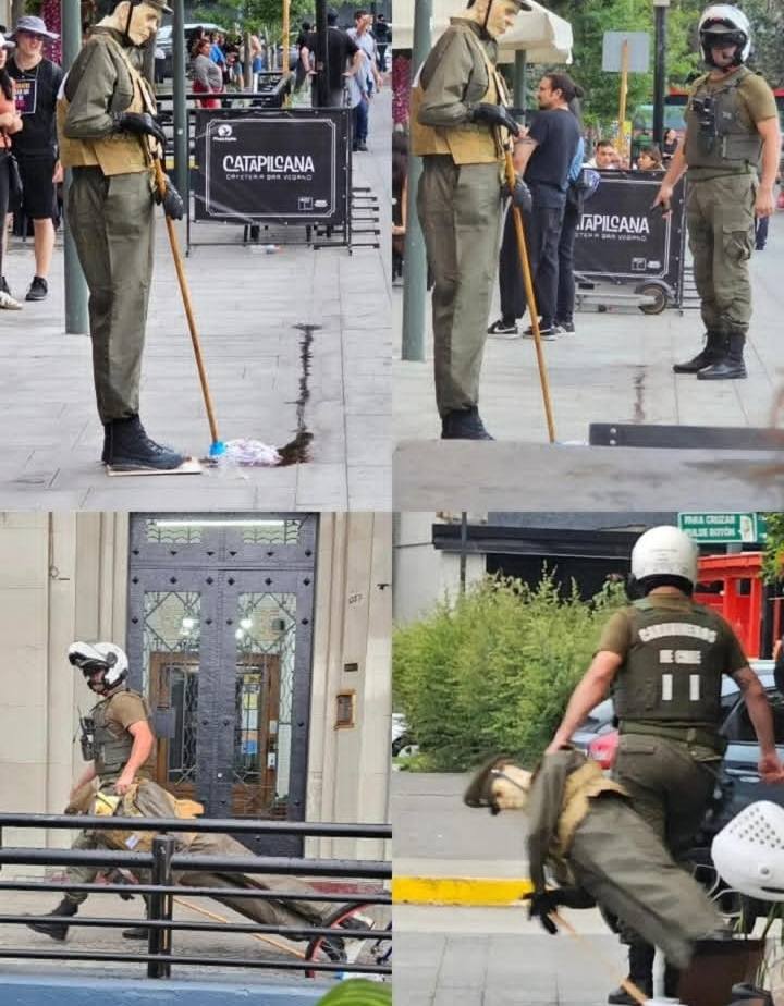 Chilean artist Francisco Tapia Salinas, popularly known as «Papas Fritas,» unveiled a «grotesque piece» on Saturday, January 31, depicting former officer Claudio Crespo Gálvez cleaning up blood. This artwork symbolizes the «image cleansing» of Carabineros in the wake of the social uprising, a process facilitated by the Naín-Retamal Law enacted by Gabriel Boric.