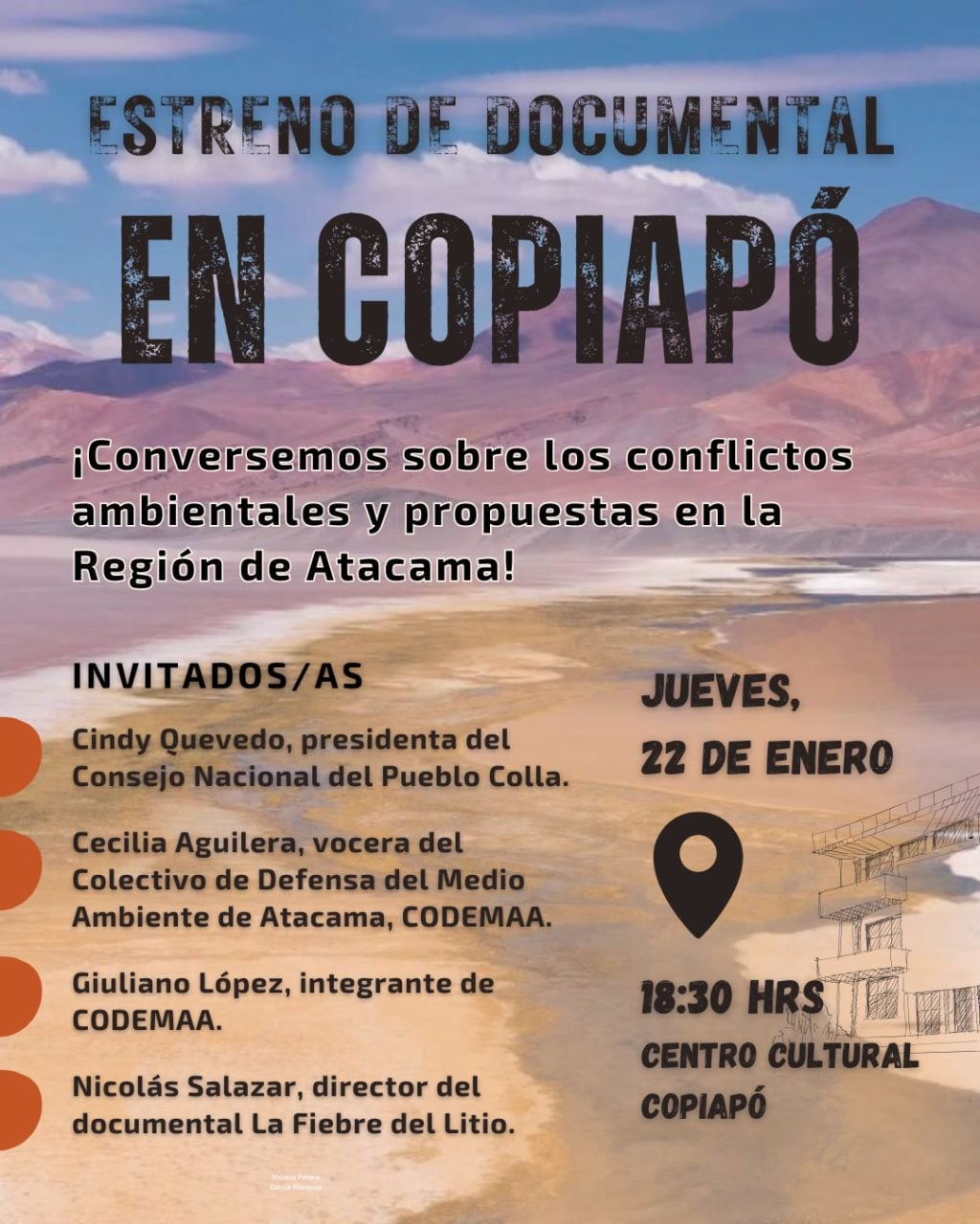 On Thursday, January 22nd at 6:30 PM, the documentary «The Lithium Fever: Shadows of the Energy Transition» will debut at the Atacama Cultural Center in Copiapó. The screening will be followed by a discussion on environmental conflicts and proposals from local organizations in the region.