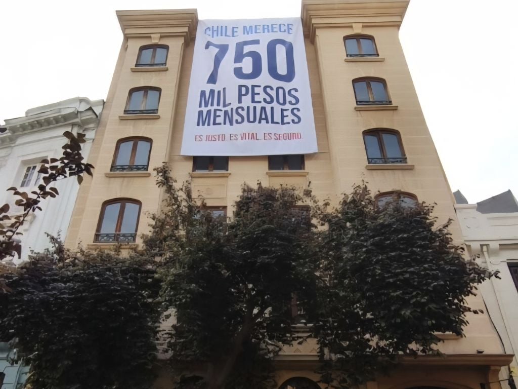 ‘Chile deserves 750,000 pesos per month. It is fair. It is vital. It is secure,’ reads the text on the piece, strategically positioned on the facade of her campaign headquarters in the Paris-Londres quarter