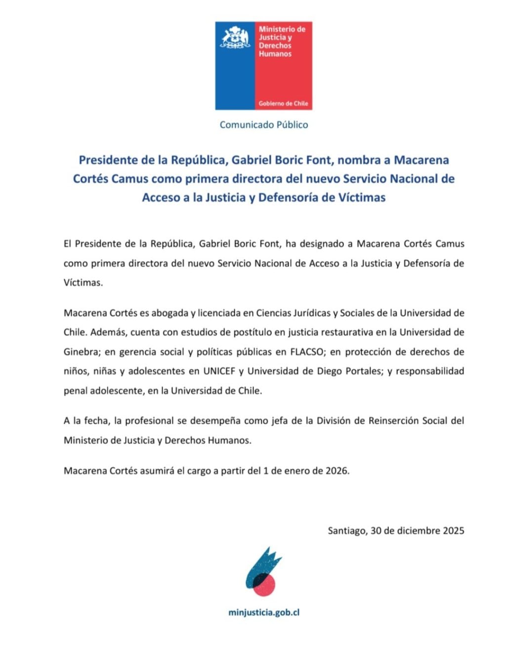 «Currently, the professional serves as the head of the Social Reintegration Division at the Ministry of Justice and Human Rights,» states the press release from La Moneda, indicating that Cortés will take office on January 1, 2026.