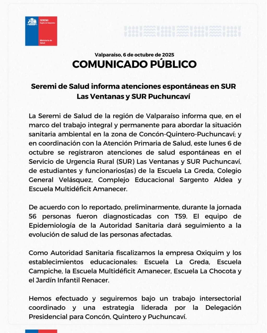 The latest episode resulted in walk-in visits to the Las Ventanas Rural Urgent Care (SUR) and the Puchuncaví SUR clinics. Those affected came from La Greda School, General Velásquez School, the Sargento Aldea Educational Complex, and the Amanecer Multi-Disability School.
