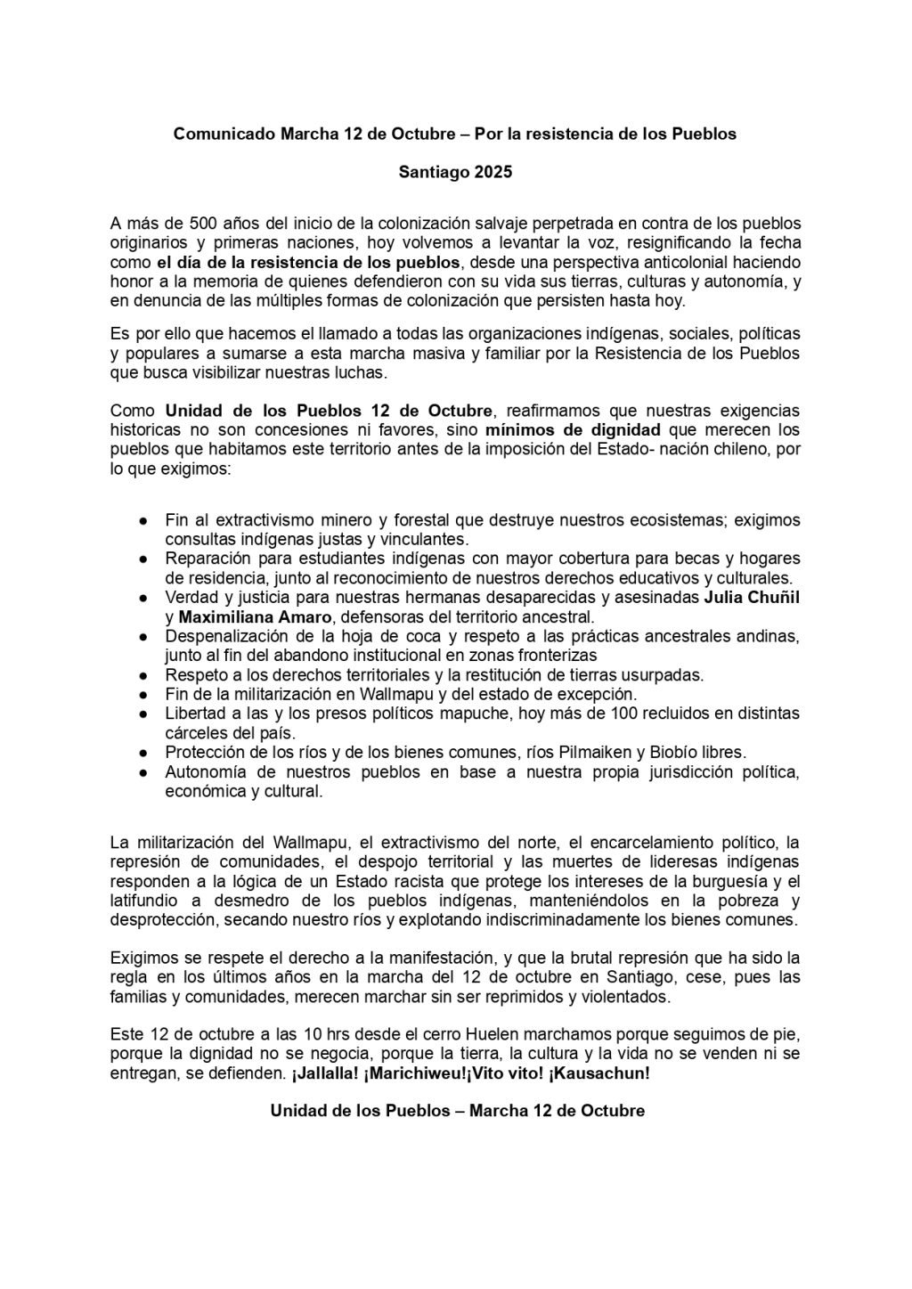 «As Unidad de los Pueblos 12 de Octubre, we reaffirm that our historic demands are not concessions or favors, but minimum standards of dignity owed to the peoples who have inhabited this territory since before the imposition of the Chilean nation-state,» the call read.