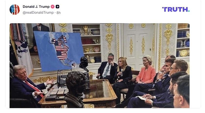 The image, shared on Truth Social on Monday night, appears to be an edited version of a photograph taken during Trump’s meeting in Washington with French President Emmanuel Macron, British Prime Minister Keir Starmer, Italian President Giorgia Meloni, German Chancellor Friedrich Merz, Finnish leader Alexander Stubb, Ukrainian President Volodymyr Zelensky, and European Commission President Ursula von der Leyen.