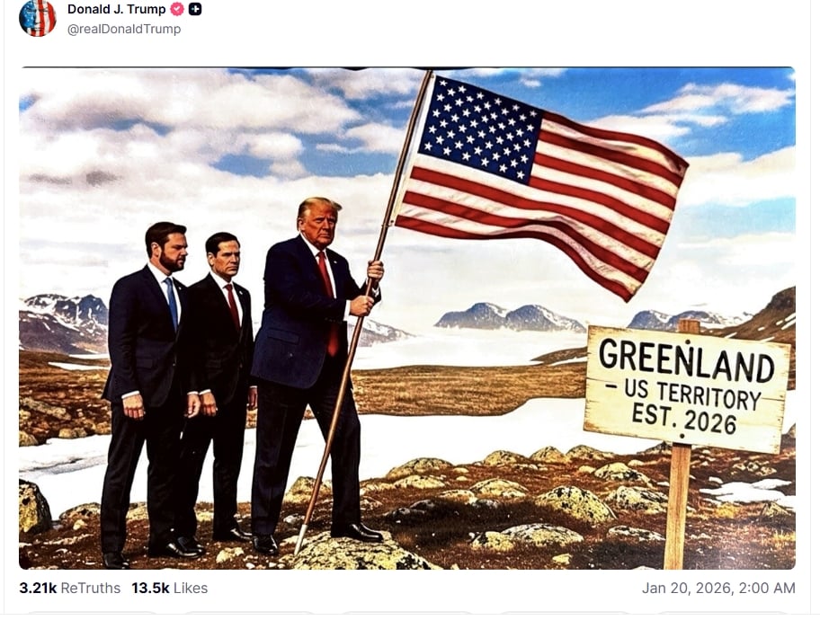Another AI-generated image shows Trump, Vice President J.D. Vance, and Secretary of State Marco Rubio in Greenland, with Trump raising an American flag on the ground next to a sign that reads: «Greenland – U.S. Territory. Est. 2026.»