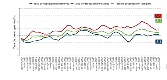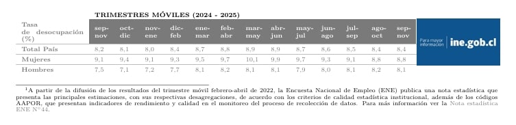 The unemployment rate in Chile reached 8.4% during the September to November 2025 quarter (SON 2025), marking a rise of 0.2 percentage points (pp) over the past year. This increase, reported by the National Employment Survey (ENE) from the National Institute of Statistics (INE), reflects a situation where job searches have not matched the pace of hiring.