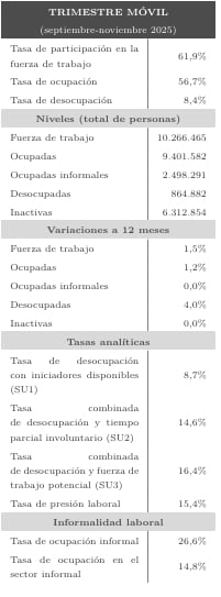 In the Metropolitan Region, the unemployment rate for the September to November 2025 quarter reached 8.9%, rising by 0.3 pp over the year. During the same period, the estimate for the total employed population grew by 1.2%, primarily influenced by the administrative and support services sector (50.7%) and information and communications (13.5%).