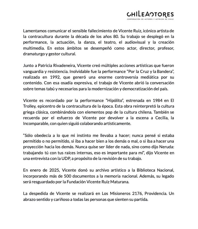 The Chilean Actors and Actresses Corporation (Chileactores) has officially announced the passing of Vicente Ruiz, a prominent artist and actor who played a significant role in the counterculture and resistance against the right-wing civil-military dictatorship during the 1980s.