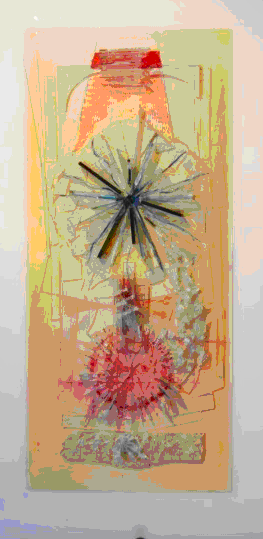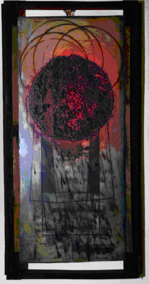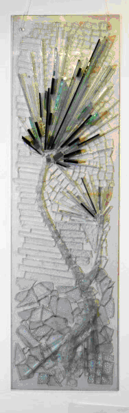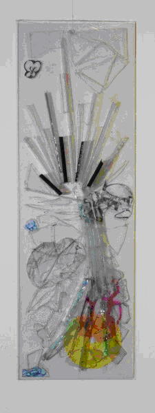 —Uso varias disciplinas para concretar una imagen. Uso polímeros como soporte para el ensamble de vidrios como material donde pueden verse fragmentos de grabado, pintura y dibujo. Sería una suerte de bajo relieve y objeto creo.