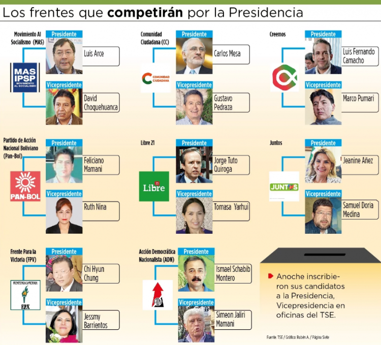 Las organizaciones políticas que hacen vida en Bolivia registraron las candidaturas en el sistema del Tribunal Supremo Electoral (TSE), de cara a las elecciones generales del 3 de mayo, después asistieron a la sede de ese organismo para entregar la documentación de respaldo.