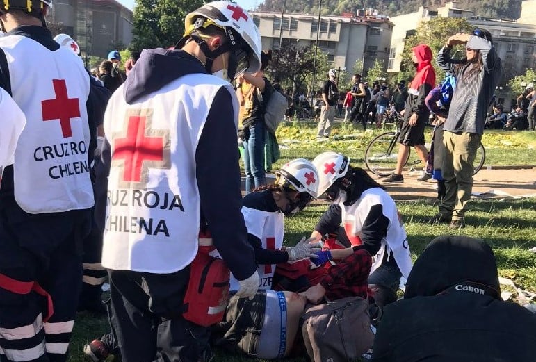 Por su parte, el contingente de la Cruz Roja Chilena que estaba apostada en el sector de Plaza Italia, atendiendo a quienes resultaban afectados o heridos, tuvo que movilizarse porque eran alcanzados por los efectos de la acción represiva del Estado. “Estamos recibiendo ataques de las Fuerzas Especiales”, denunció un vocero de la Cruz Roja, quien añadió que les impedían hasta salir a buscar a los heridos por el actuar de la policía.