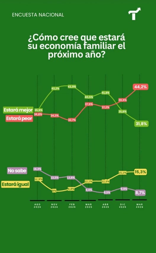El deterioro de la imagen presidencial no ocurre en el vacío, sino que es acompañado por un cambio radical en las percepciones sobre la economía y la responsabilidad política. Por primera vez en los últimos meses, las curvas de expectativas se han cruzado. Según el estudio de Tendencias, una mayoría de los consultados cree que su economía familiar estará peor el año que viene. Específicamente, el 44,2% de los encuestados respondió que su situación empeorará, frente a un 31,8% que cree que mejorará, un 15,3% que pronostica que seguirá igual y un 8,7% que no sabe.