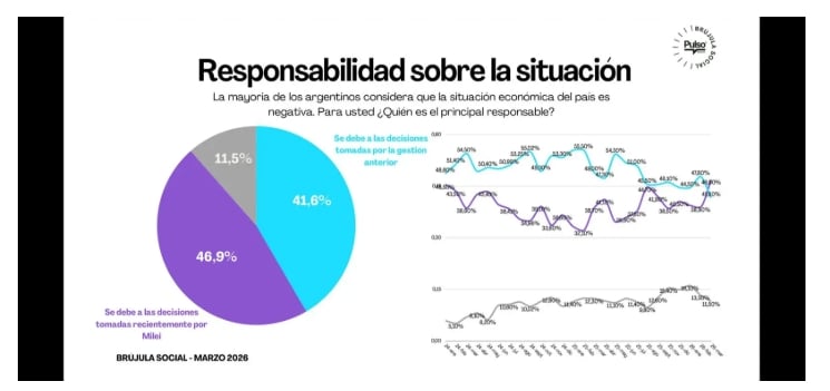 Para entender la magnitud de la crisis política, resulta clave observar la reversión de una tendencia que venía sosteniendo la administración libertaria: la pérdida de eficacia del relato sobre la “herencia maldita”. En marzo, la consultora Pulso, dirigida por Juan Adaro, detectó que tradicionalmente, la mayoría de los argentinos atribuía la situación del país al gobierno de Alberto Fernández. Sin embargo, por primera vez, esta tendencia se revirtió. Ante la pregunta sobre quién es el responsable de la situación actual, el 46,9% respondió que es el gobierno de Javier Milei, mientras que el 41,6% lo atribuyó al gobierno anterior.