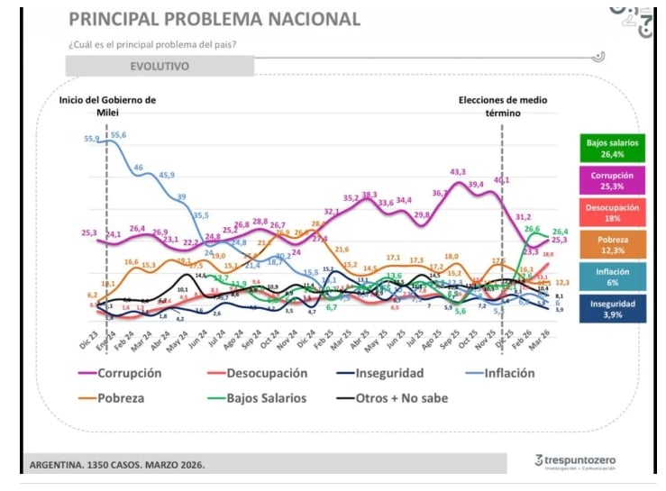 Esta caída de las expectativas se combina con un cambio en la agenda de preocupaciones de los argentinos. El estudio de Trespuntozero reveló que, por primera vez, los bajos salarios se posicionan como el principal problema del país austral, encabezando la tabla con un 26,4%. Le siguen con porcentajes altos la desocupación (18%) y la pobreza (12,3%), completando un panorama de malestar concentrado en la economía del bolsillo.