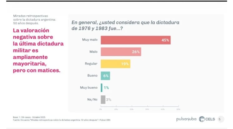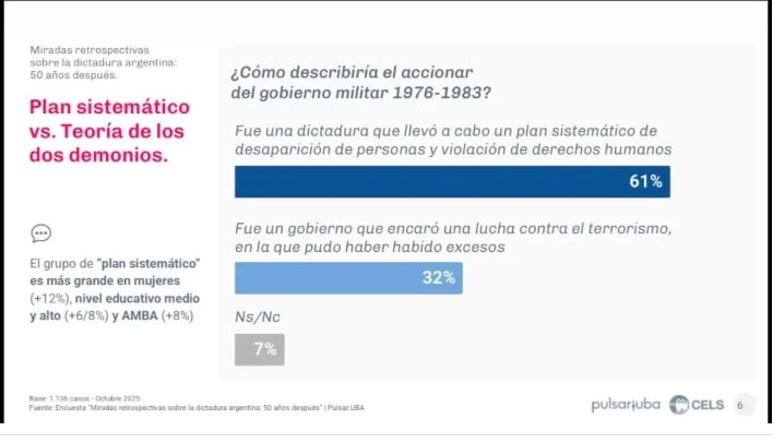 El estudio no solo indaga en el rechazo a la dictadura, sino en cómo la sociedad interpreta aquel período. Los resultados muestran el arraigo profundo de la perspectiva de los derechos humanos. «Para la mayor parte de la población, el período se explica principalmente como un plan sistemático de desaparición de personas y violaciones a los derechos humanos (61%)», detalla el informe elaborado a partir de una encuesta realizada en octubre de 2025 sobre una muestra de 1136 casos en todo el país austral.