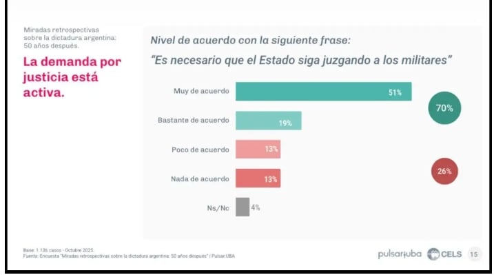 Esta internalización del paradigma de los derechos humanos se traduce también en un respaldo contundente a la continuidad de los procesos judiciales. Según la encuesta, siete de cada diez consultados se manifestaron de acuerdo con que el Estado continúe juzgando a los militares responsables de los crímenes de lesa humanidad.