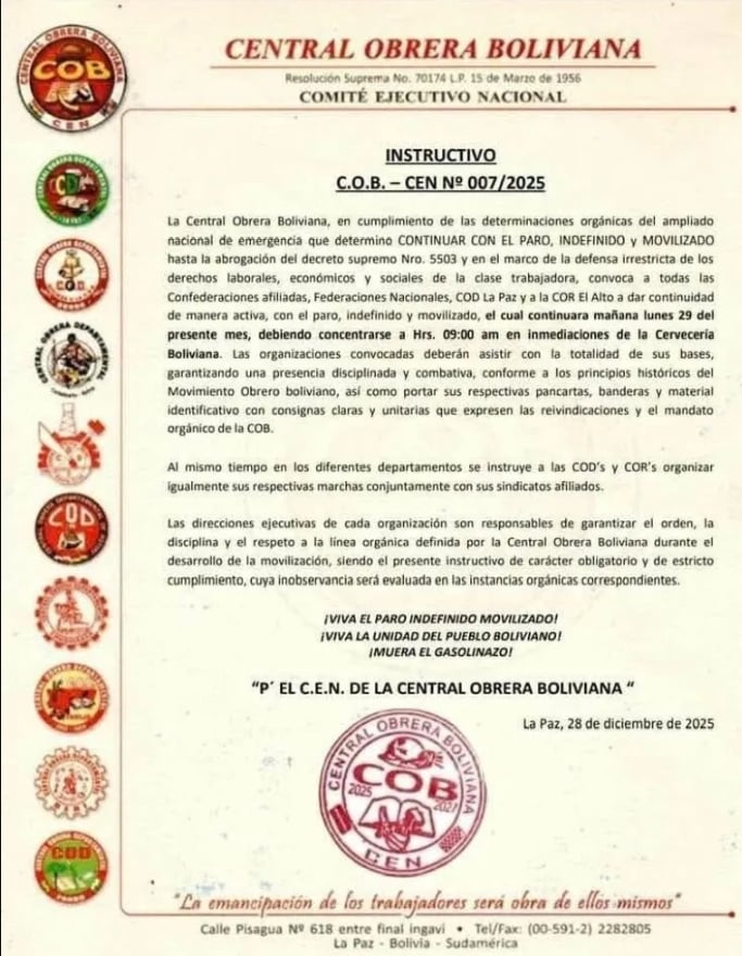 La COB, en un plenario realizado incluso en vísperas navideñas, ratificó que no levantará la huelga mientras el decreto continúe vigente. Su dirigencia plantea que el movimiento debe sostenerse y radicalizarse mediante asambleas fabriles, comandos de lucha y coordinación territorial.