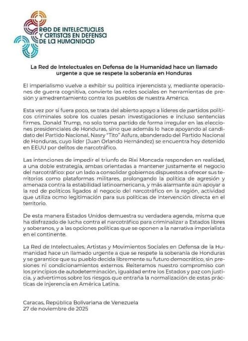 La Red de Intelectuales, Artistas y Movimientos Sociales en Defensa de la Humanidad  alertó sobre una grave intervención extranjera en el proceso electoral de Honduras, acusando al mandatario estadounidense Donald Trump y a Washington de desplegar “operaciones de guerra cognitiva” para presionar y amedrentar al pueblo hondureño y evitar el triunfo  de la candidata presidencial por el Partido Libertad y Refundación (Libre), Rixi Moncada, en las elecciones del próximo 30 de noviembre.