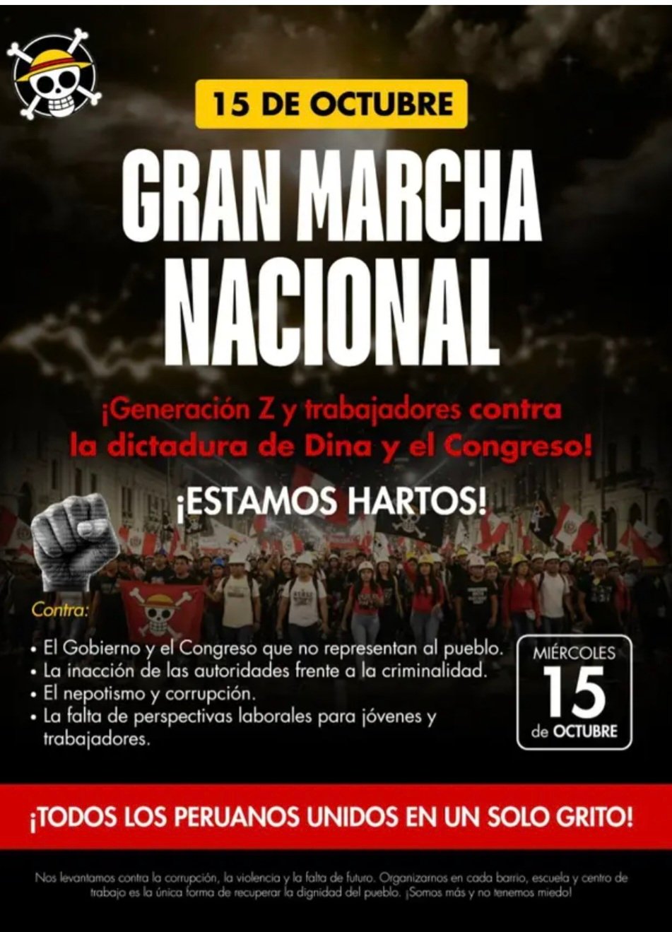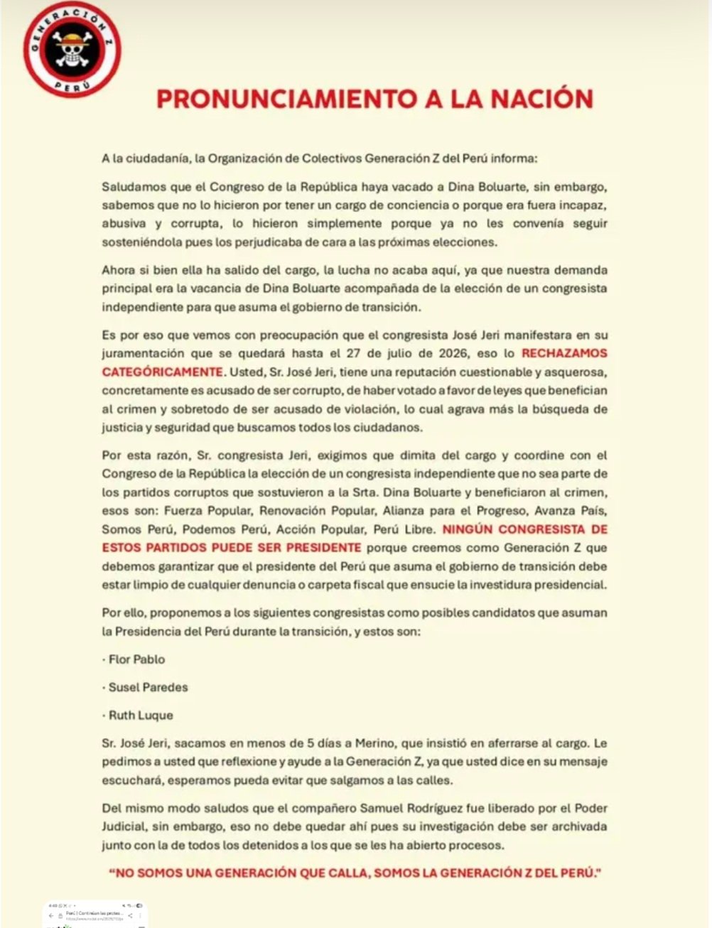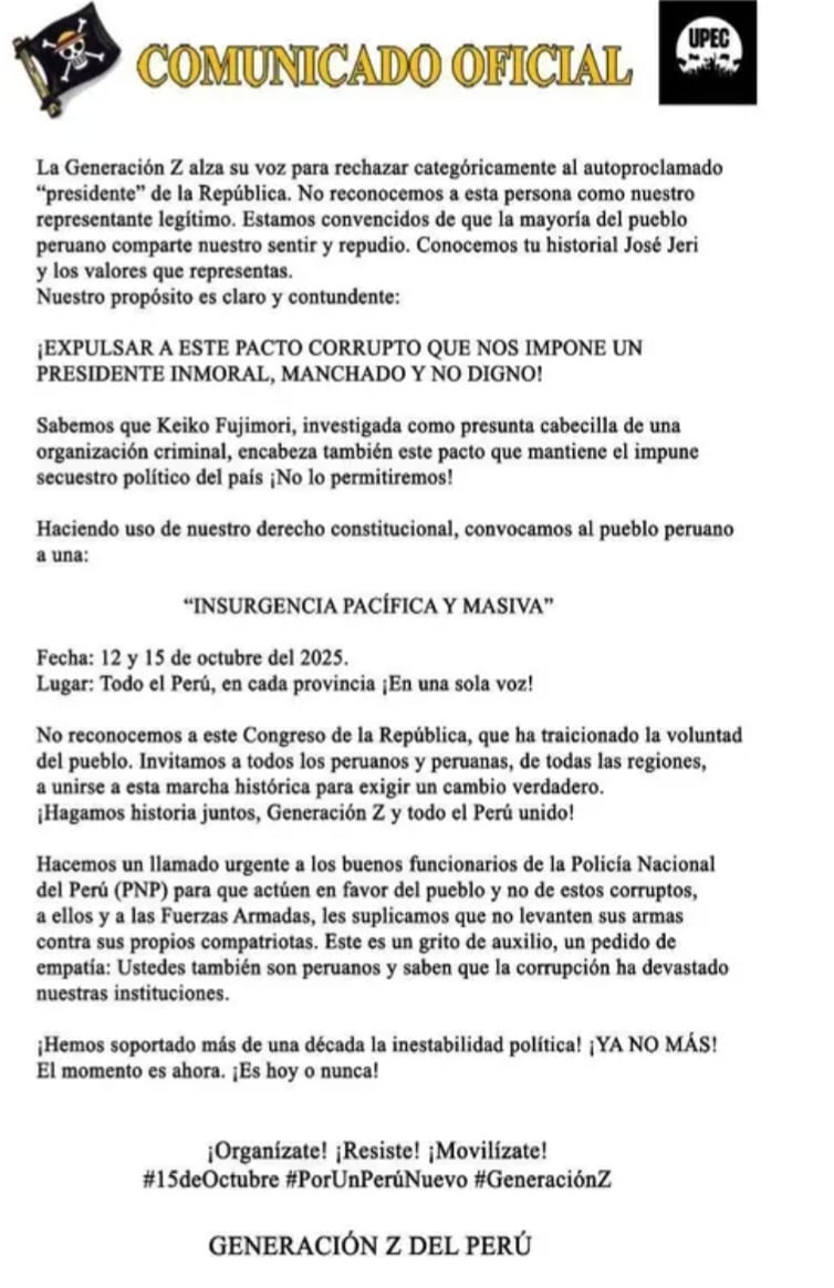 El mensaje es una clara advertencia al presidente, a quien comparan con Manuel Merino, cuyo breve gobierno en 2020 cayó tras masivas protestas. «No reconocemos a este Congreso de la República, que ha traicionado la voluntad del pueblo. Invitamos a todos los peruanos y peruanas, de todas las regiones a unirse a esta marcha histórica para exigir un cambio verdadero. ¡Hagamos historia juntos, Generación Z y todo el Perú unido!», indicaron en el texto, que además incluye un llamado a la Policía Nacional del Perú (PNP) para que brinde su apoyo al «pueblo».