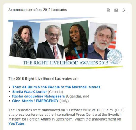 Los Premios Nobel alternativos, fueron anunciados en Estocolmo, en el Centro Internacional de Prensa del Ministerio sueco de Relaciones Exteriores. Ole von Uexkull, el director ejecutivo de los galardones, ha destacado que “los laureados, con su trabajo incansable, tanto en terreno como en los tribunales, sostienen los valores que llevaron a la creación de las Naciones Unidas 70 años atrás. En este año de crisis humanitarias globales, ellos proporcionan respuestas inspiradoras a los desafíos que signan nuestro tiempo”.