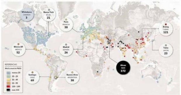 A nivel general, en el mapa se puede apreciar que los puntos más conflictivos del planeta están en el oriente medio y en China e India. Pero esto no significa que el resto está bien: en Europa, donde la mayoría están en verde claro, todavía muchas ciudades siguen teniendo niveles superiores a los recomendados por la OMS.