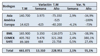 A nivel global, el inventario visible en las tres principales bolsas (Londres, Shanghái y Nueva York) suma 661.071 toneladas, con un incremento anual acumulado del 55,1%.