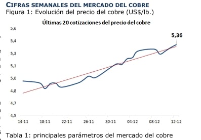 El pasado viernes 12 de diciembre, el precio del cobre cerró en US$ 5,36 la libra, lo que representa un aumento del 1,5% respecto al cierre de la semana anterior. Sin embargo, este resultado constituye un nuevo máximo histórico, al elevar el precio promedio anual a US$ 4,47 la libra, ubicándose 7,5% por encima del registrado en el mismo período de 2024, según datos del Informe Semanal del Mercado Internacional del Cobre.
