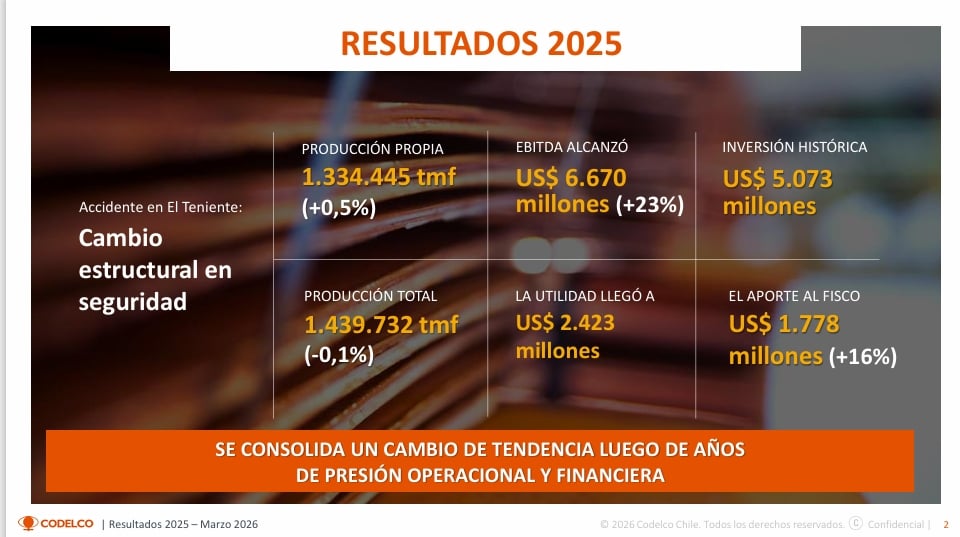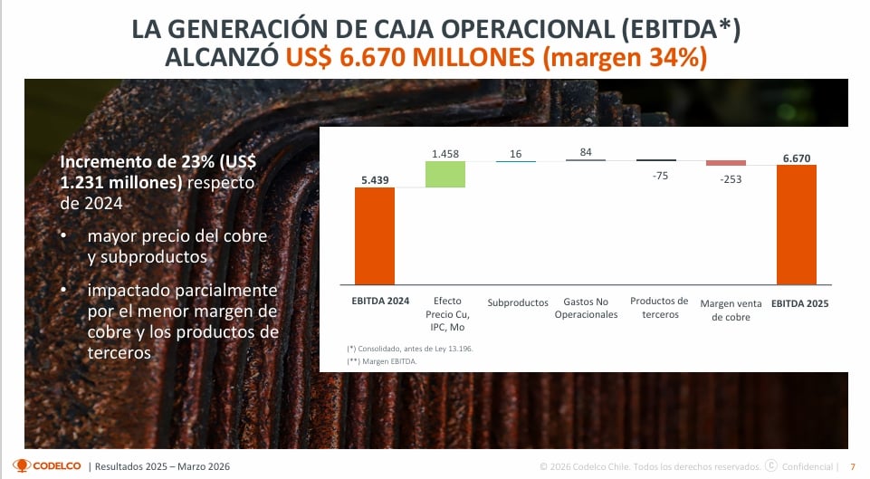 El resultado financiero de Codelco no se limita al aporte directo. La estatal reportó un Ebitda (utilidad antes de impuestos, intereses, depreciación y amortización) de US$ 6.670 millones durante 2025, lo que representa un crecimiento del 23% respecto a los US$ 5.439 millones del año anterior.