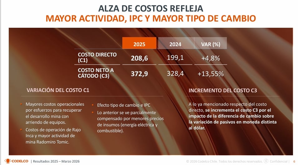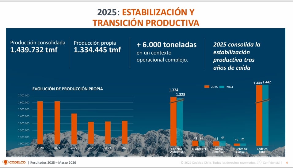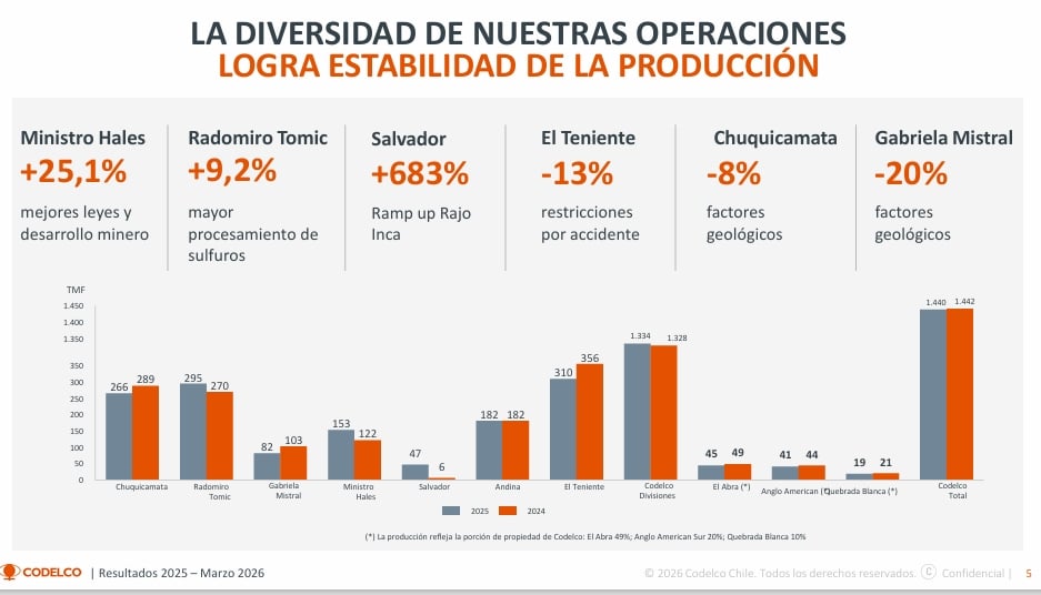Las divisiones mostraron diferentes desempeños. Mientras que el yacimiento Ministro Holes experimentó un espectacular aumento del 25,1% en su producción, alcanzando las 153 mil tmf, y Radomiro Tomic creció un 9,2% hasta las 295 mil tmf, la División El Teniente sufrió una contracción del 13%, situándose en 310 mil toneladas, producto de las restricciones posteriores al accidente fatal registrado en sus instalaciones. Asimismo, Chuquicamata descendió un 8% y Gabriela Mistral un 20,3%, esta última debido al deterioro en las leyes de mineral.