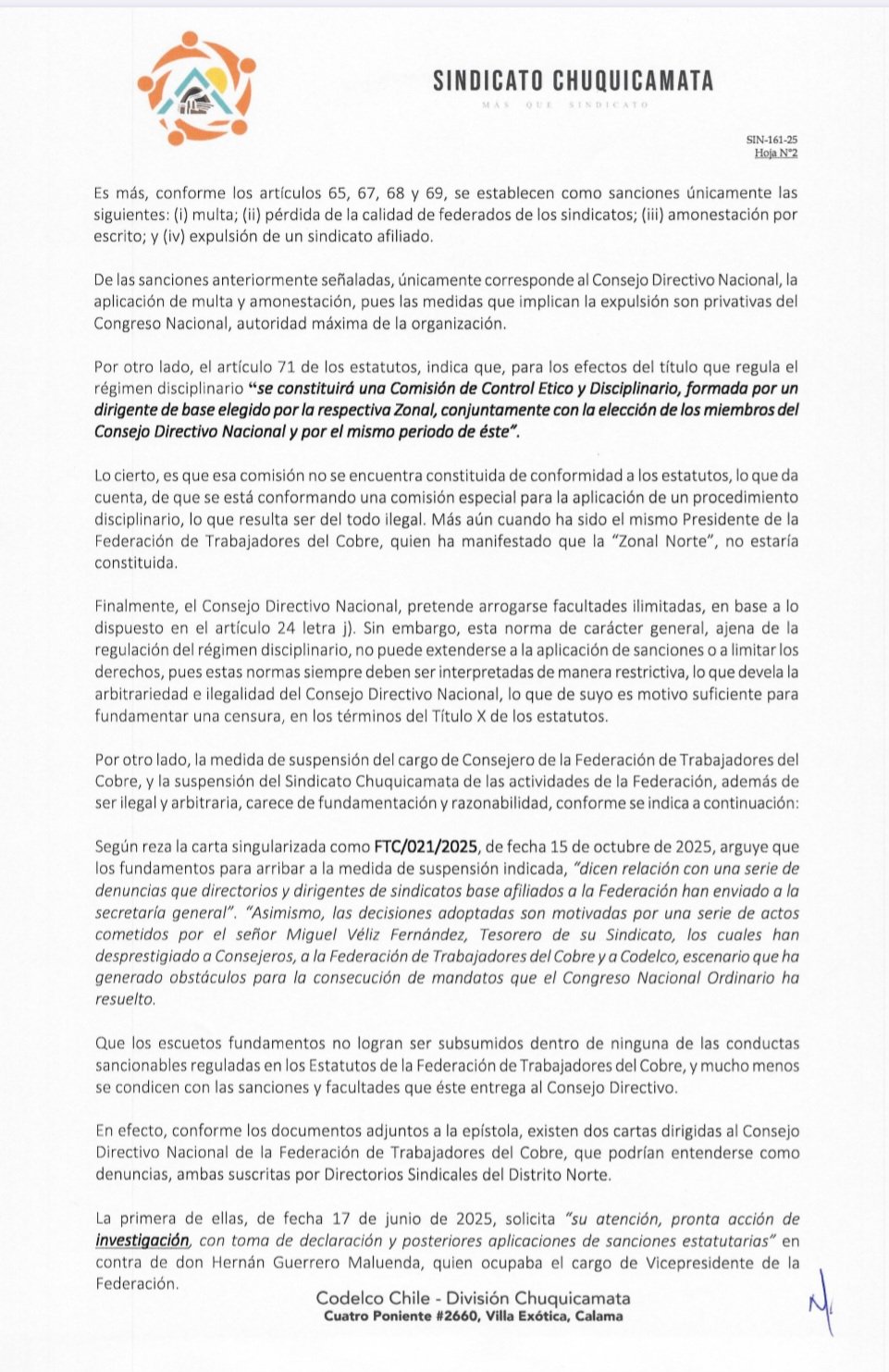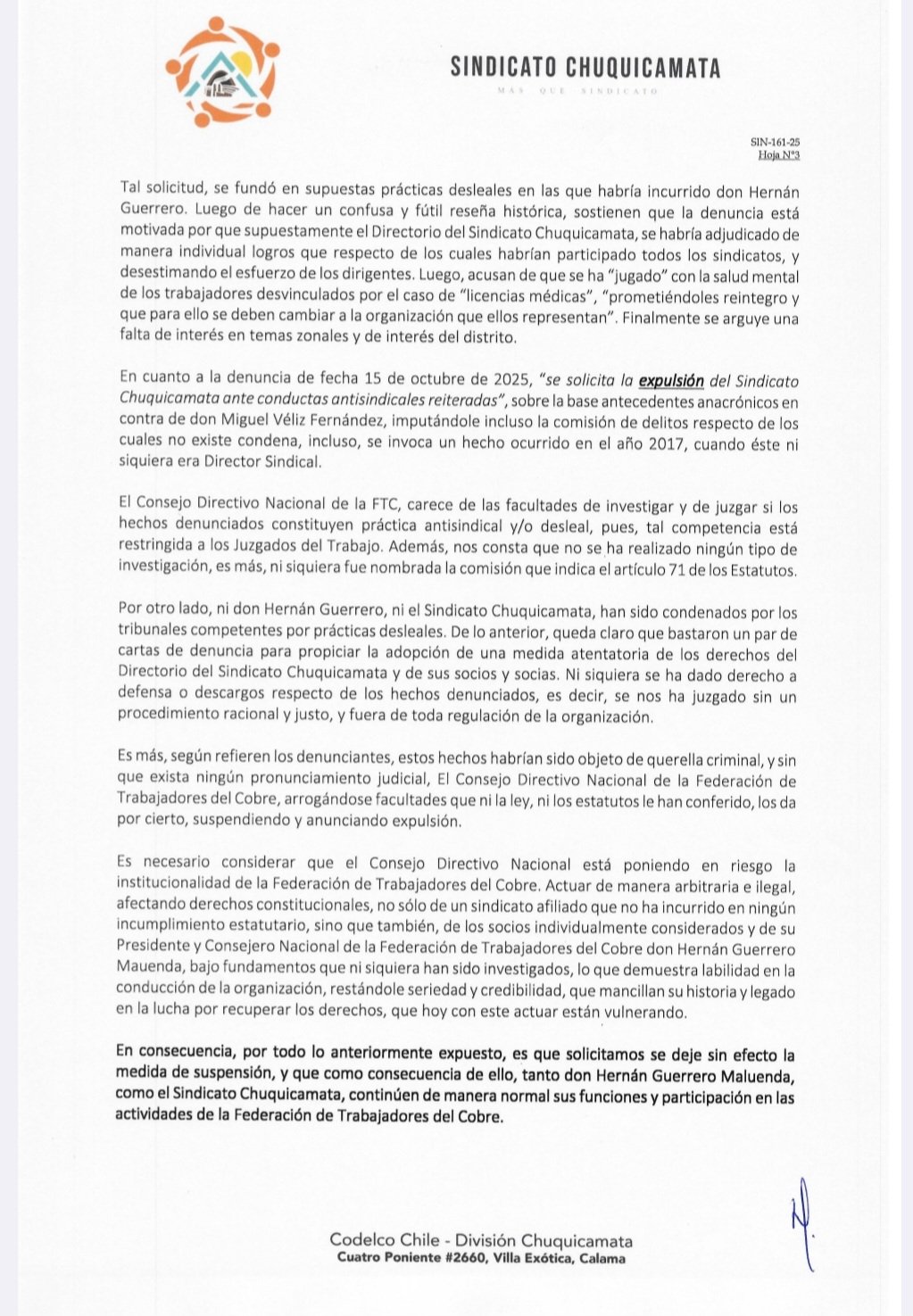 Además, en la misiva, advirtieron que el Consejo está poniendo en riesgo la institucionalidad de la Federación de Trabajadores del Cobre, al actuar de manera arbitraria y legal afectando derechos constitucionales no solo de un sindicato afiliado, que no ha incurrido en ningún incumplimiento estatuario, sino también de los socios individualmente considerados y de su presidente y consejero nacional de la Federación de Trabajadores del Cobre don Hernán Guerrero Manuenda, » bajo fundamentos que ni siquiera han sido investigados, lo que demuestra la habilidad en la conducción de la organización restándole seriedad y credibilidad que mancillan su historia y legado en la lucha por recuperar los derechos que hoy con este actuar están vulnerando»,