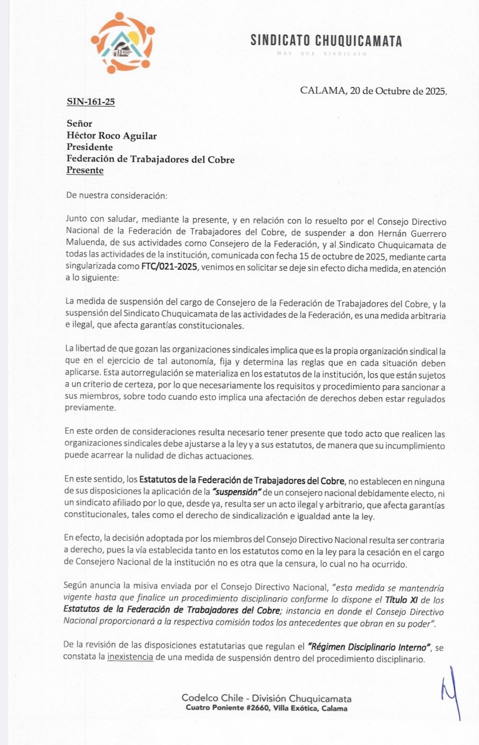 En una comunicación enviada por el sindicato a Héctor Roco Aguilar presidente de la FTC desde el sindicato Chuquicamata indicaron que estas suspensiones constituyen una medida arbitraria e ilegal que afecta garantías constitucionales.