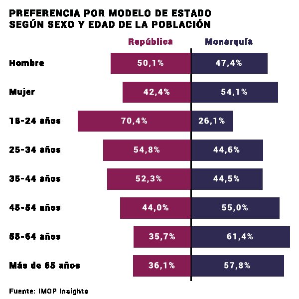 El rango que más simpatiza con la monarquía es el de los hombres y mujeres entre los 55 y los 64 años, que comprenden un 61,4 % de partidarios, frente al 35,7 % que expresó ser republicano.