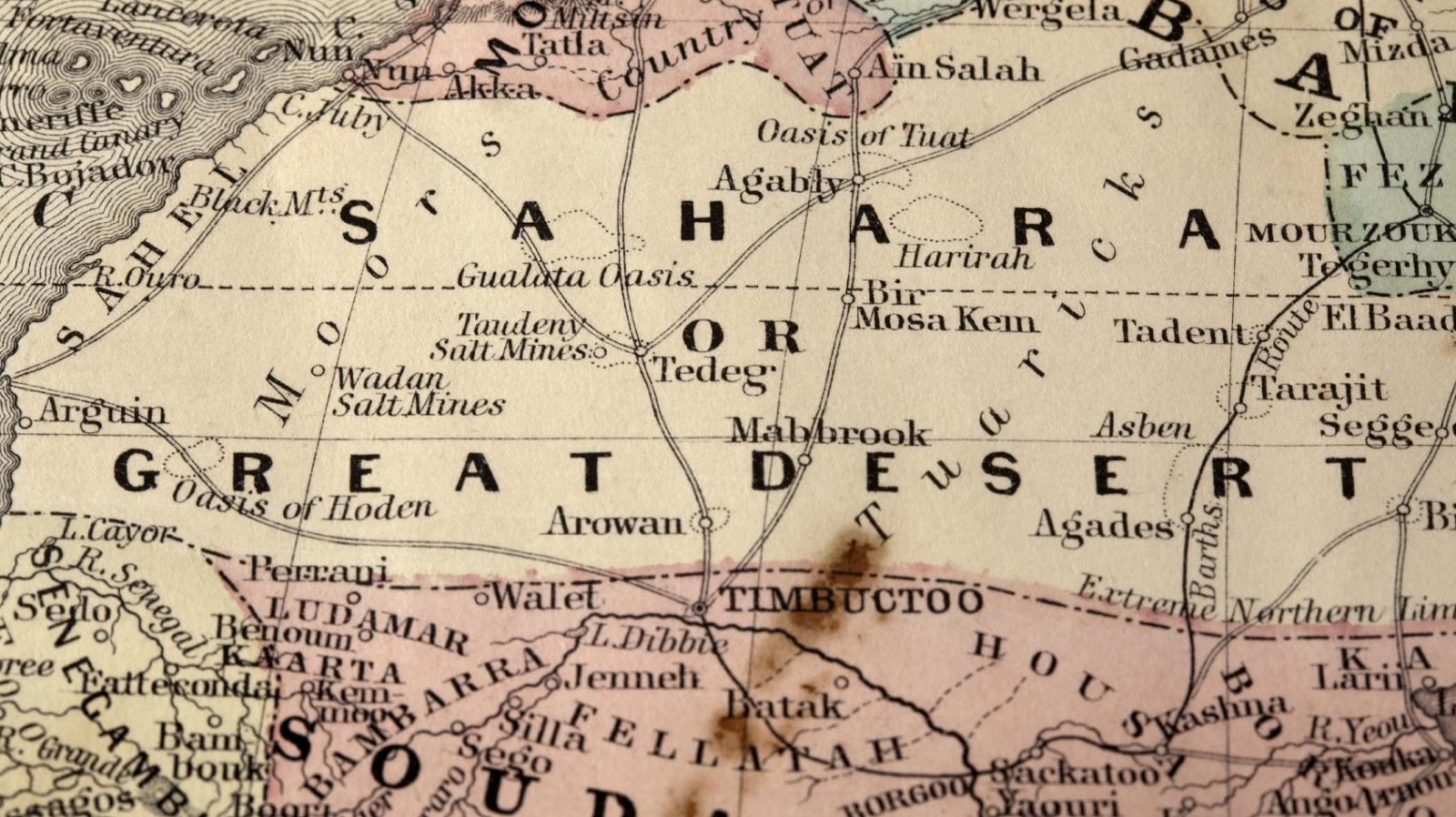 Mapa vintage del desierto del Sahara con la situación de la mítica ciudad de Tombuctú,.