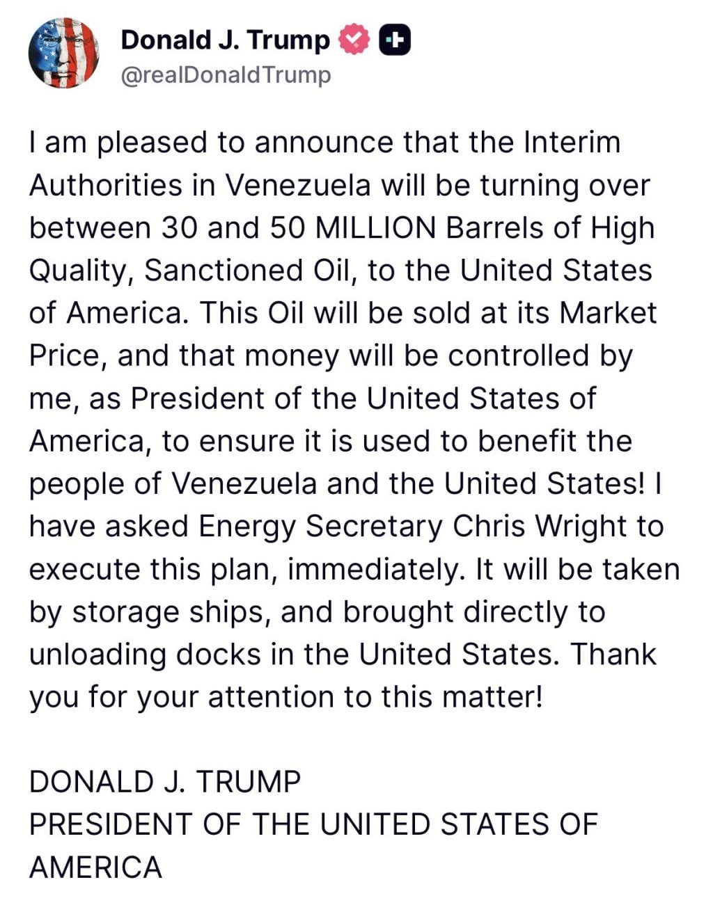«Me complace anunciar que las Autoridades Provisionales de Venezuela entregarán entre 30 y 50 millones de barriles de petróleo de alta calidad y autorizado a los Estados Unidos», escribió el cuestionado mandatario en su red social personal.