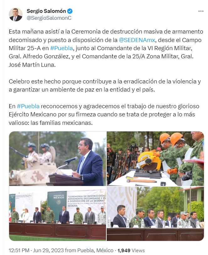 El gobernador del estado de Puebla, Sergio Salomón Céspedes Peregrina, encabezó este jueves la ceremonia de destrucción masiva de armamento decomisado y puesto a disposición de la Secretaría de la Defensa Nacional (Sedena).