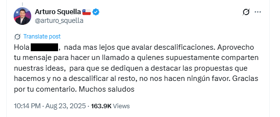 Frustrada por la continuación del hostigamiento, la denunciante volvió a emplazar públicamente a Squella en agosto a través de la misma red social. El 23 de agosto, el presidente republicano le contestó de manera pública desde su cuenta @arturo_squella: