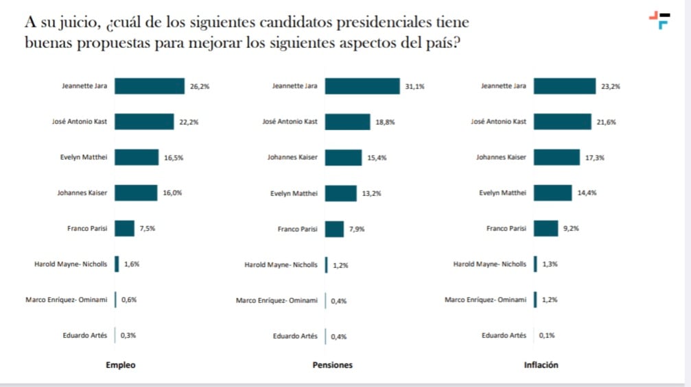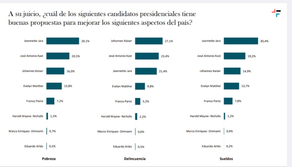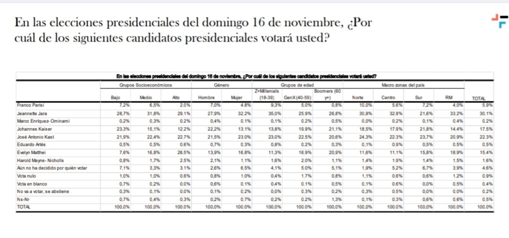 Ante la pregunta: «En las elecciones presidenciales del domingo 16 de noviembre, ¿Por cuál de los siguientes candidatos presidenciales votará usted?“, el 30,1% de los consultados se decantó por la exministra del Trabajo y Previsión Social, dejando en claro que sigue al frente de las preferencias-