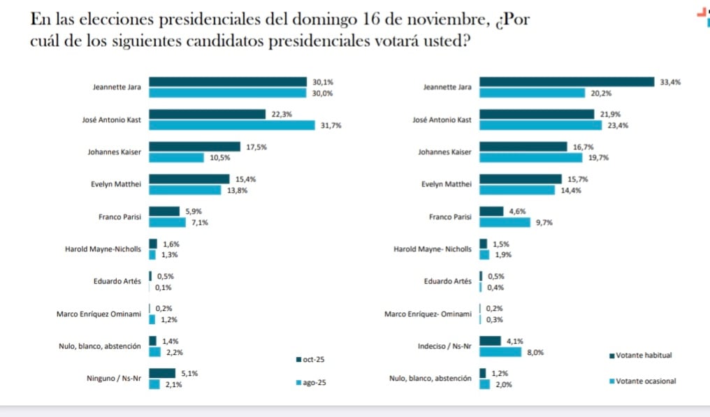 Según la medición, aplicada entre el 18 y el 22 de octubre de 2025, en segundo lugar se ubicó la carta del Partido Republicano, José Antonio Kast, con un 22,3% de la intención de voto.