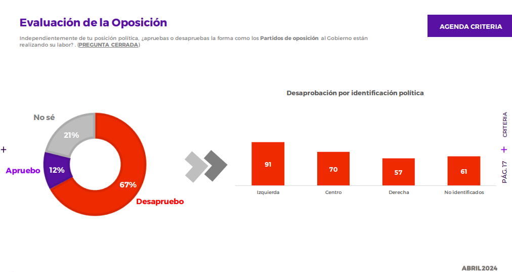 El estudio de opinión correspondiente al mes de abril, por primera vez, incluyó la siguiente pregunta: “Independientemente de tu posición política, ¿apruebas o desapruebas la forma como los partidos de oposición al Gobierno están realizando su labor?”.