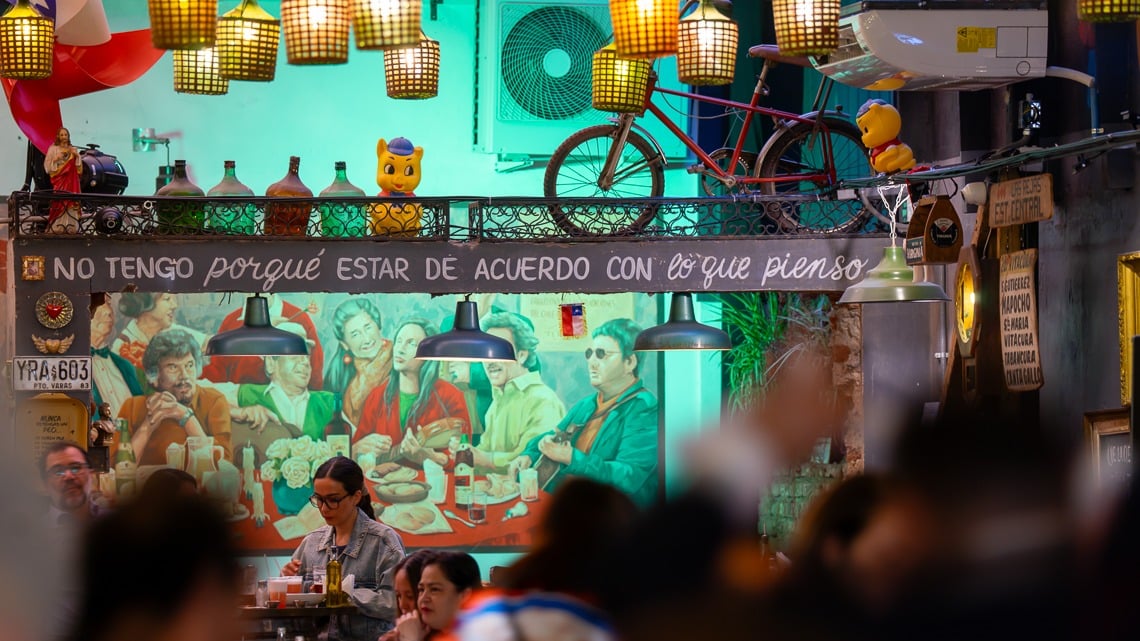 En cuanto a la decoración, nada está al azar: 600 chuicas de vino convertidas en lámparas cuelgan del techo, iluminando de manera cálida el enorme galpón que además cuenta con un mural que muestra a importantes exponentes de la música y la cultura nacional como el tío Roberto Parra, Álvaro Henríquez, Tommy Rey, Margot Loyola y Violeta Parra, entre otros.