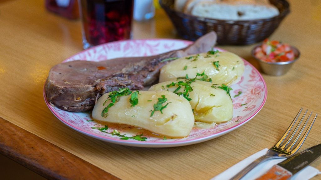 Destacamos la media lengüita con papas cocidas. Un plato que escapa a la inmediatez de la cocina contemporánea, una elaboración sin tanto artificio ni pretensiones. Acá lo que se ofrece es la clásica receta de antaño que se prepara con paciencia para lograr una textura melosa, que acompañada de los tubérculos, logra un final perfecto y una invitación a recordar la cocina popular chilena.